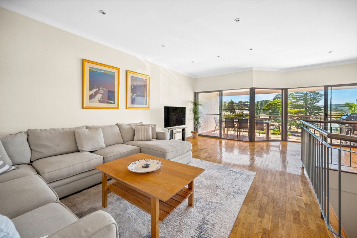The open-plan living area is located on the upper level of the property, offering breathtaking views of Avoca Beach. The living room is tastefully furnished and features comfortable seating and a flat-screen TV, perfect for relaxing after a day at the beach. Sliding doors lead out onto a covered balcony, providing the perfect spot to sit and soak up the view.