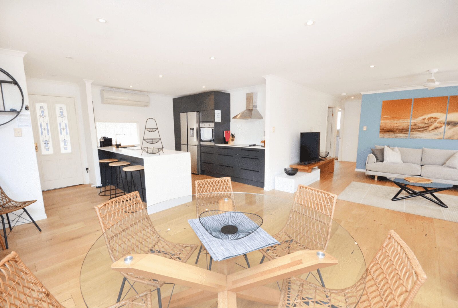 The spacious living room is perfect for relaxing and spending time with family and friends. It features comfortable seating and plenty of natural light, creating a warm and inviting atmosphere. The room also has a TV with complimentary Foxtel and Netflix and entertainment system, providing ample options for movie nights or watching your favourite shows.