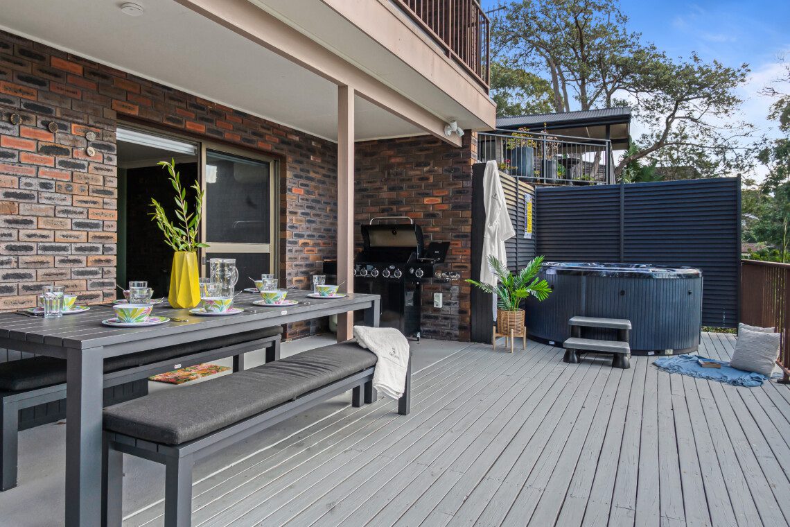 The home offers a choice of large entertaining decks, each providing delightful water outlooks to enhance your relaxation experience. Additionally, generous sun-drenched gardens, framed by established trees, surround the property, creating a tranquil oasis where you can bask in the warmth of the sun and enjoy the beauty of nature. For those who enjoy outdoor cooking, a BBQ is available, perfect for hosting gatherings and enjoying delicious grilled meals amidst the picturesque surroundings. The property now also features a new outdoor spa, providing a luxurious spot to unwind and soak in the serene environment, making it the ultimate retreat for relaxation and leisure.