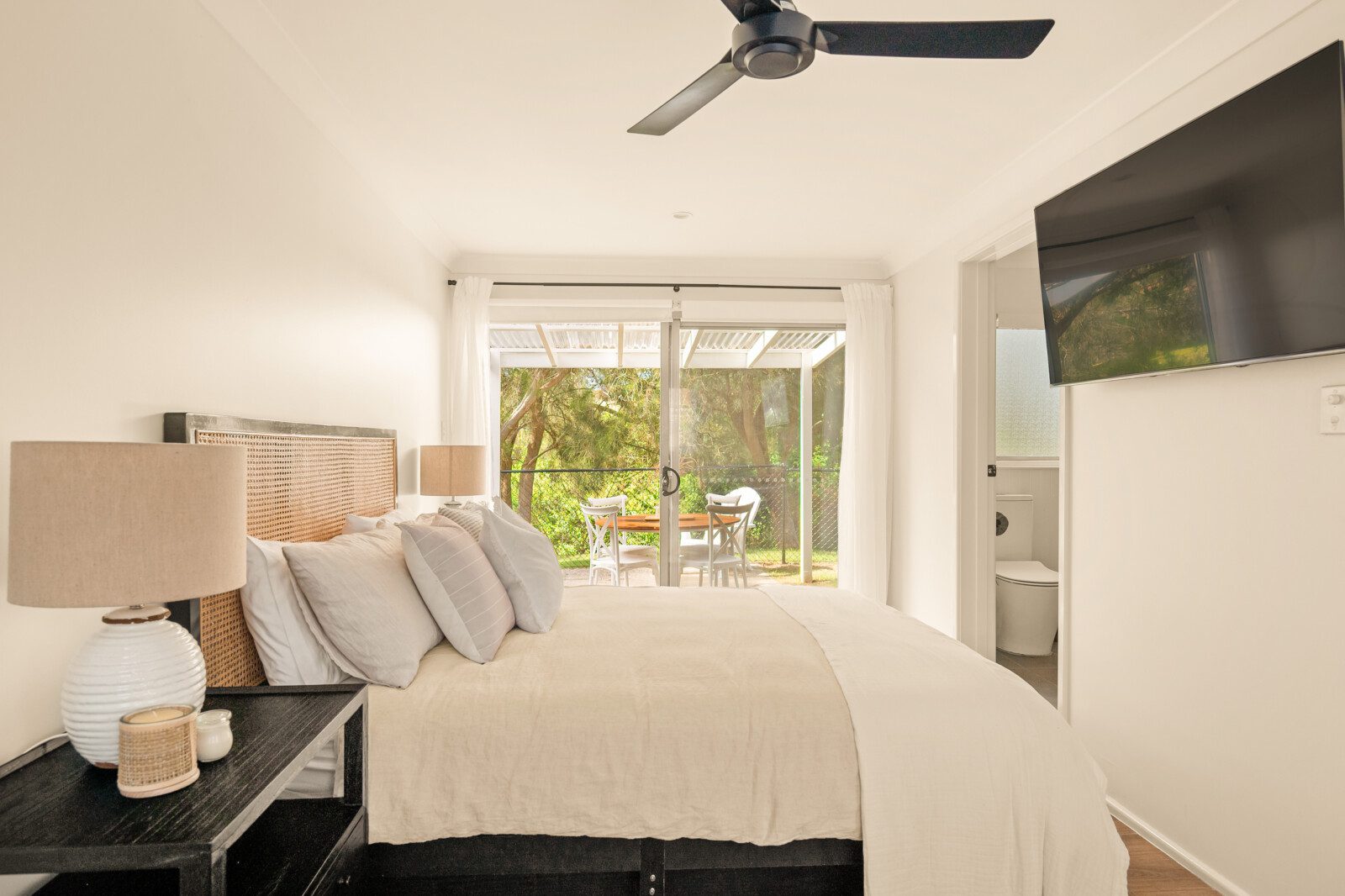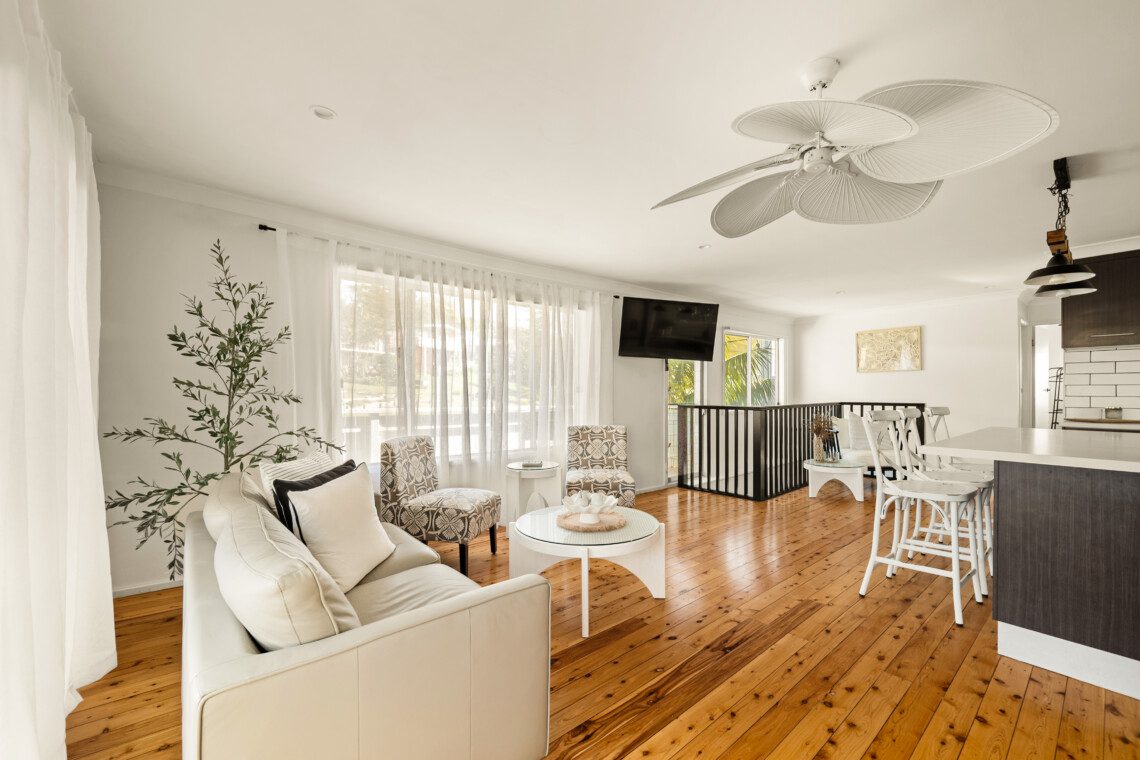 The expansive open space combining living, kitchen, and dining area is designed to be the heart of the home, inviting guests to cook, gather, play games, or unwind in front of the TV. The kitchen is fully equipped with all the essentials, boasting modern appliances and a convenient breakfast bar for casual dining or meal preparation. Step outside to the large undercover entertaining area, seamlessly extending the indoor living space outdoors. With a BBQ grill at your disposal, this space is perfect for al fresco dining and entertaining. Whether it’s a sunny brunch or a starlit dinner, the inviting atmosphere encourages guests to bring the indoors out and create lasting memories in this coastal retreat.