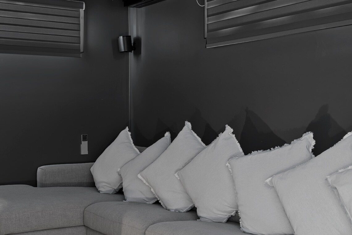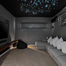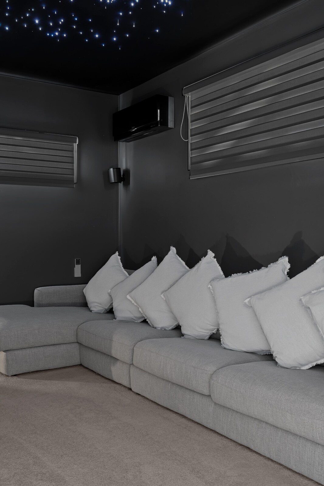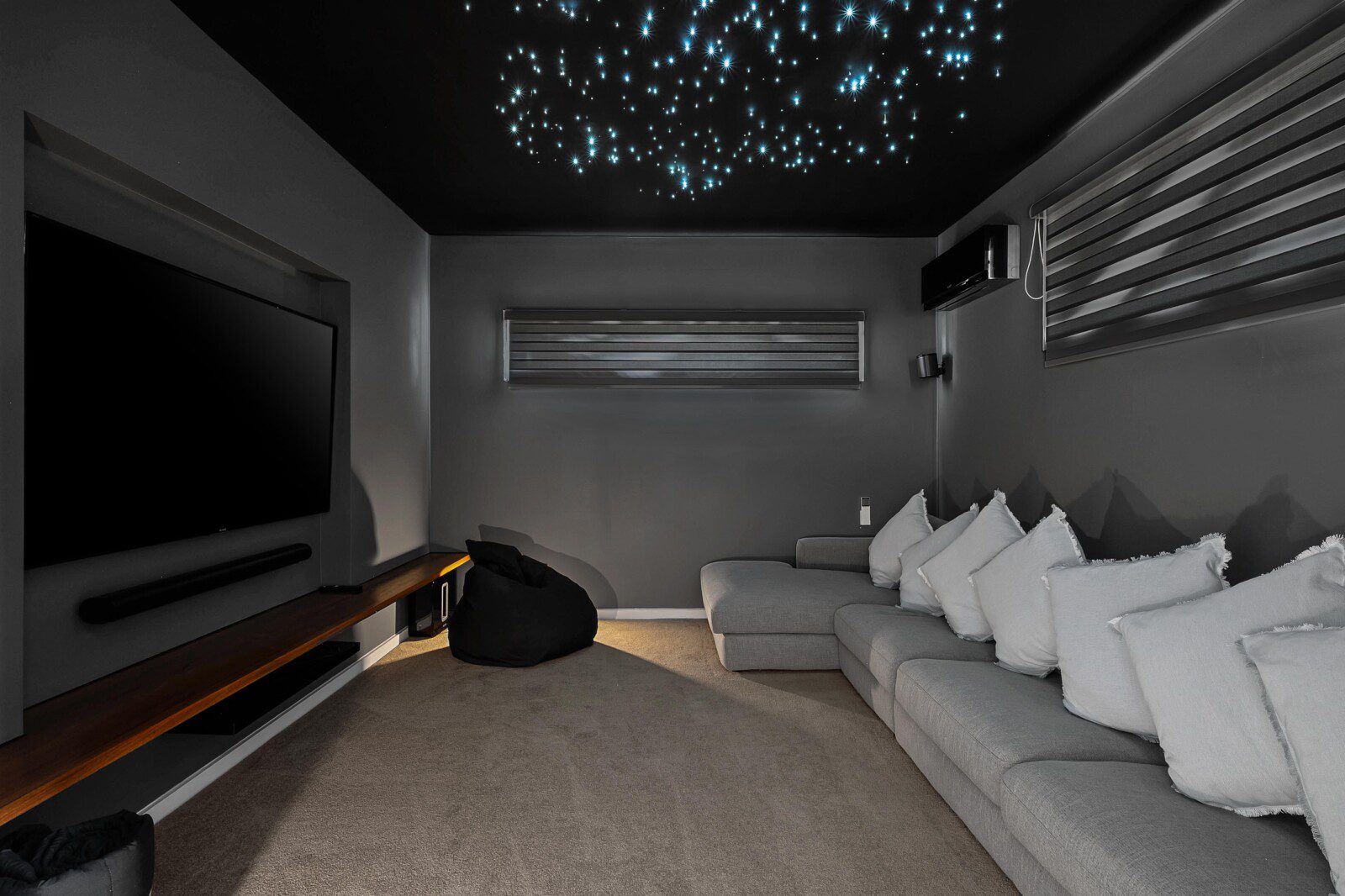 As you enter, the holiday spirit instantly welcomes you. Just off the entry, the media room beckons with its large smart TV and twinkling star-lit ceiling, ready to turn an ordinary movie night into something truly magical.