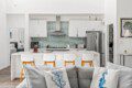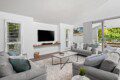 The heart of the home is the open-plan kitchen, living and dining area, where style meets function and every moment becomes a shared experience. Sunlight pours through expansive windows, casting a warm glow over plush seating arranged around a second smart TV – an inviting spot for lazy mornings or afternoon downtime.