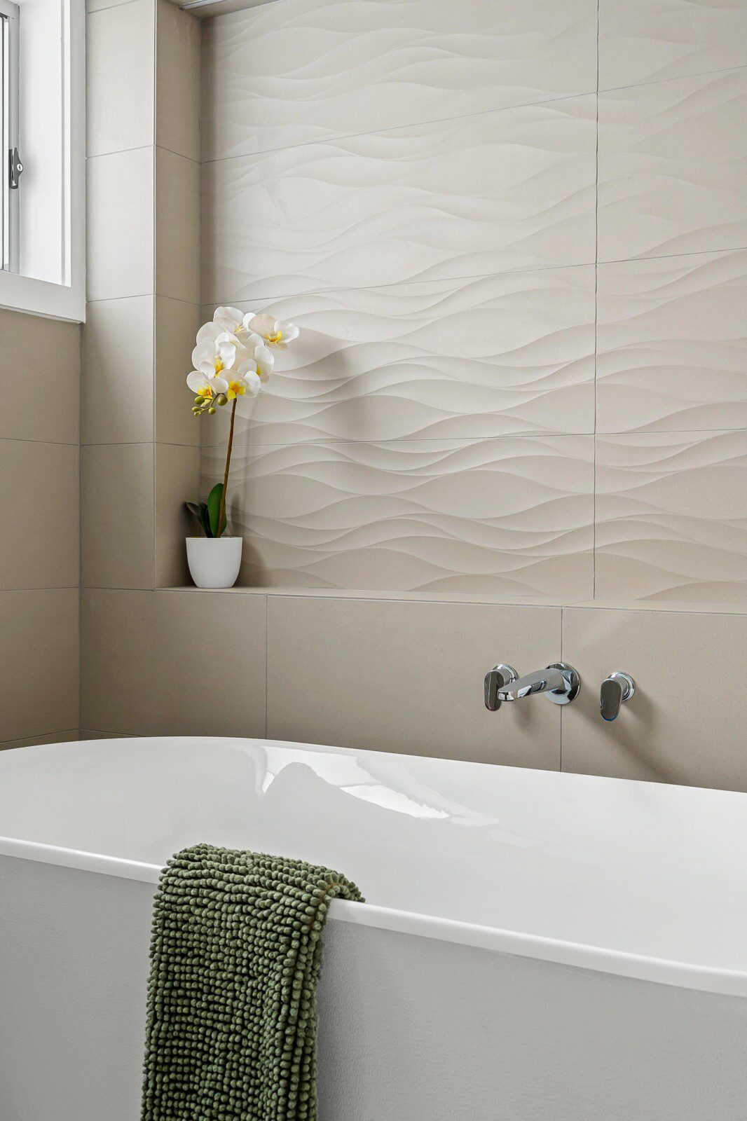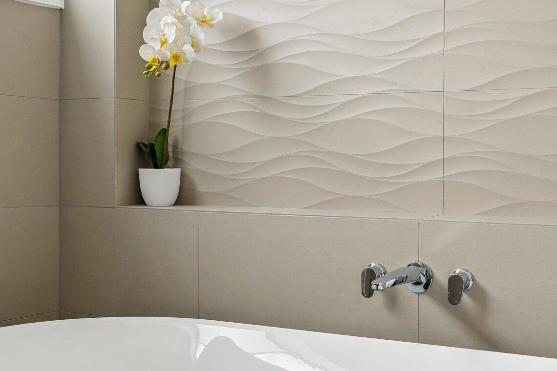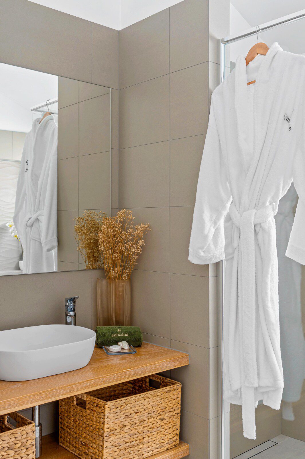 The main bathroom is a spa-like retreat, featuring a deep bathtub perfect for soaking after a day at the beach, a sleek walk-in shower, an elegant vanity, and a separate WC for added convenience.