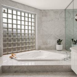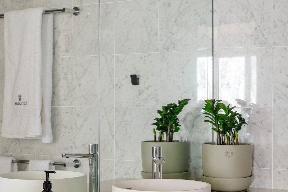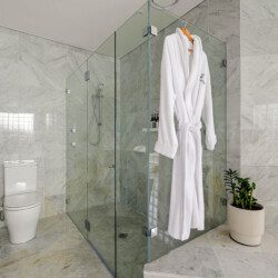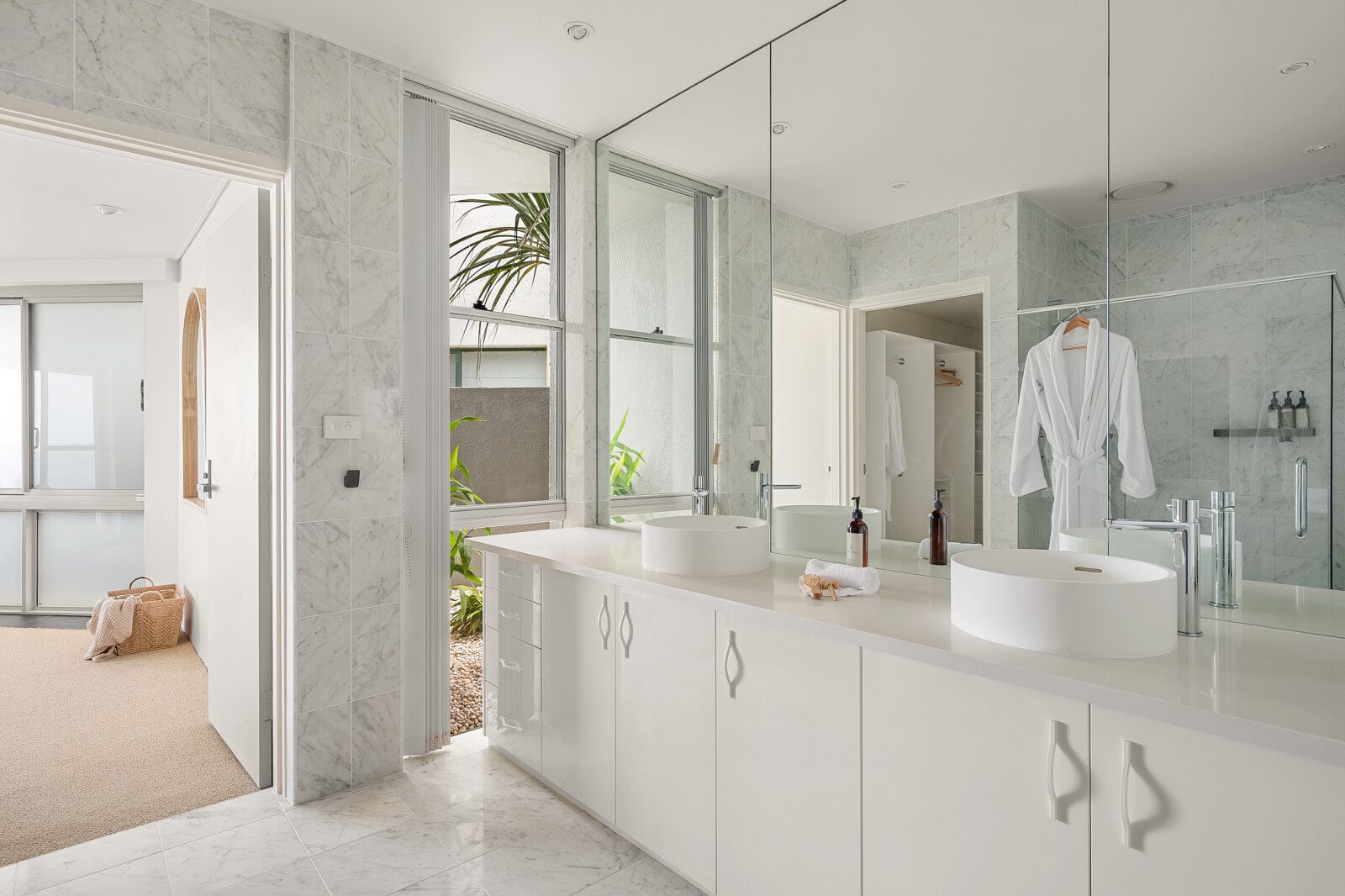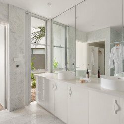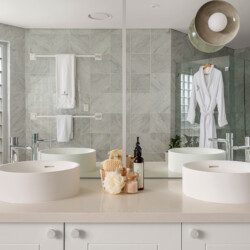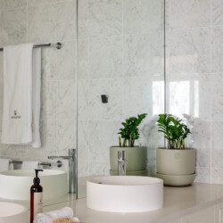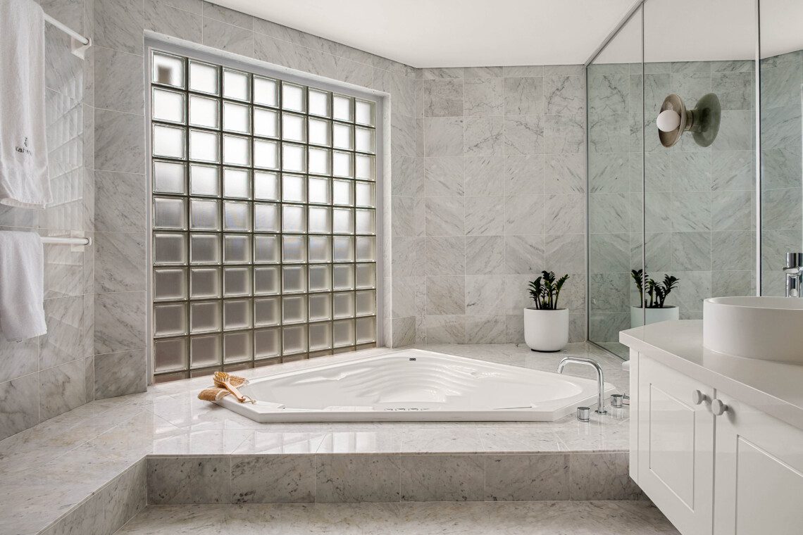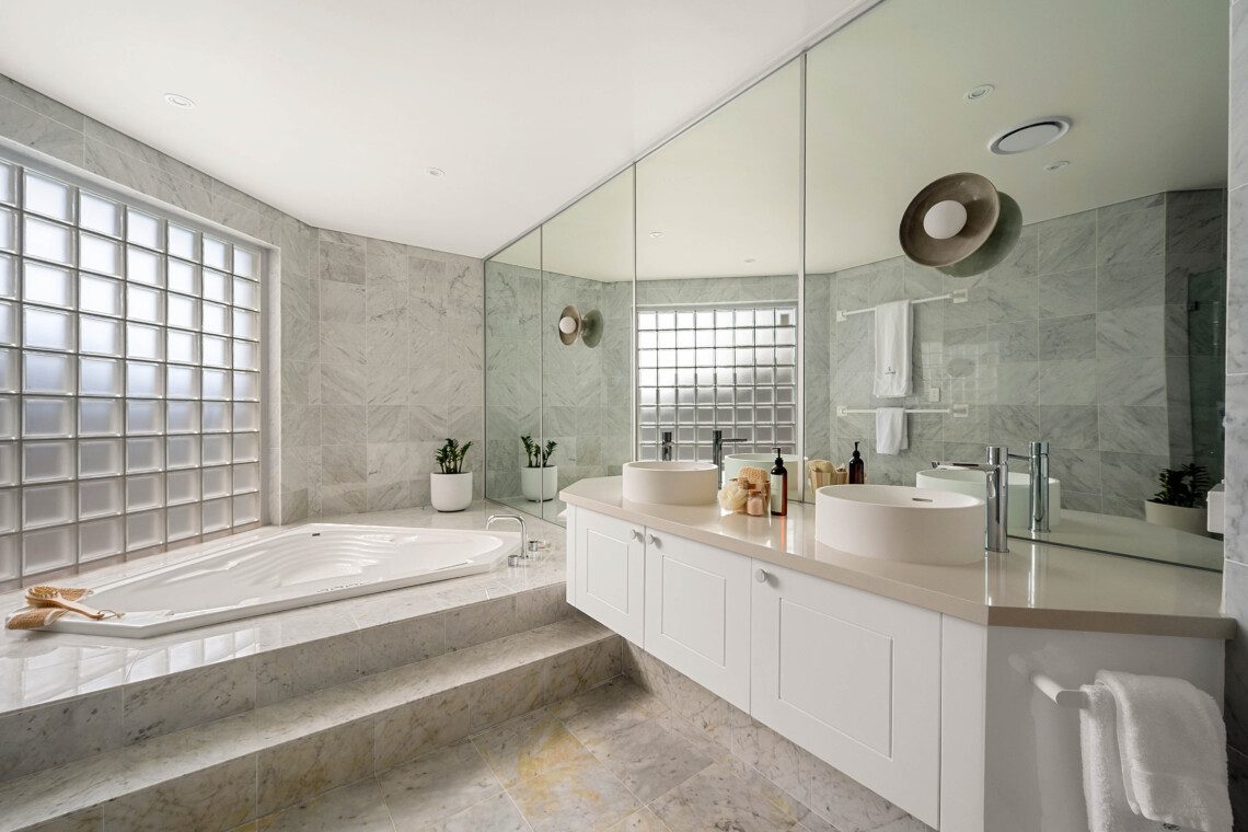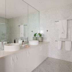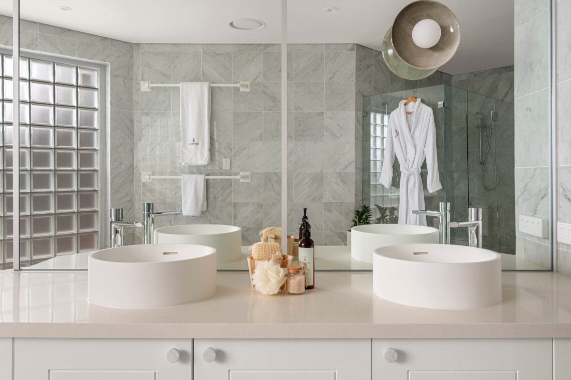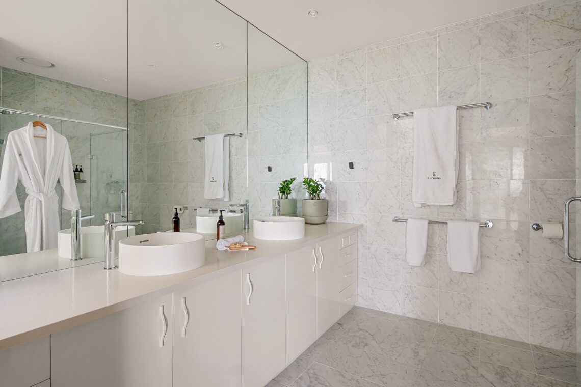 The bathrooms are havens of tranquillity. The master suite features a double vanity, shower, and WC, while the main bathroom includes a sunken spa bath, double vanity and shower heads plus WC.