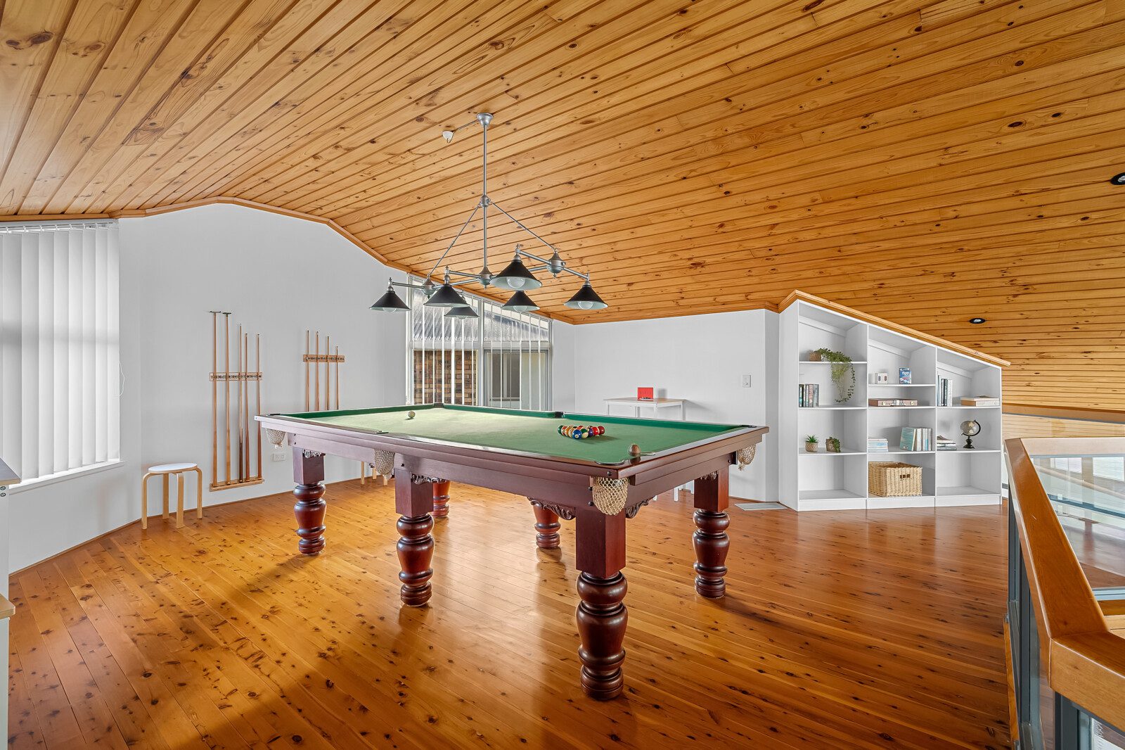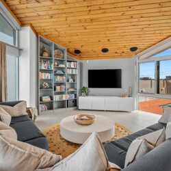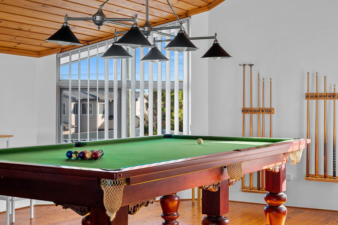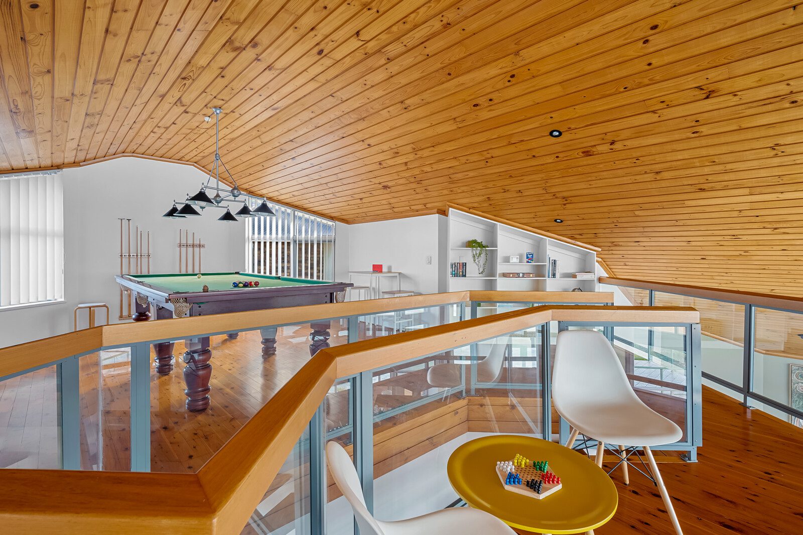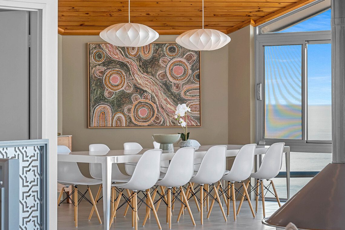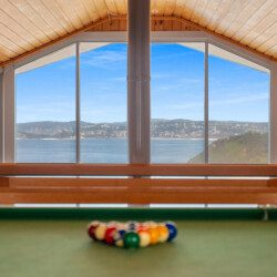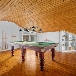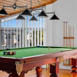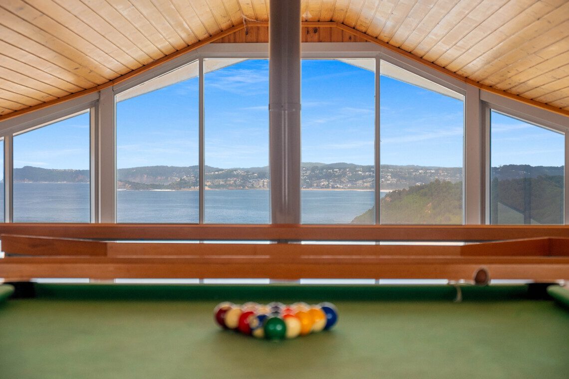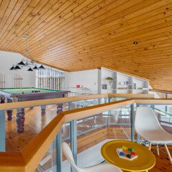 Above the living spaces, the mezzanine’s game room with its pool table as the centrepiece offers panoramic views and a stage for sunrise yoga, sunset cocktails or peaceful reflection.