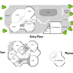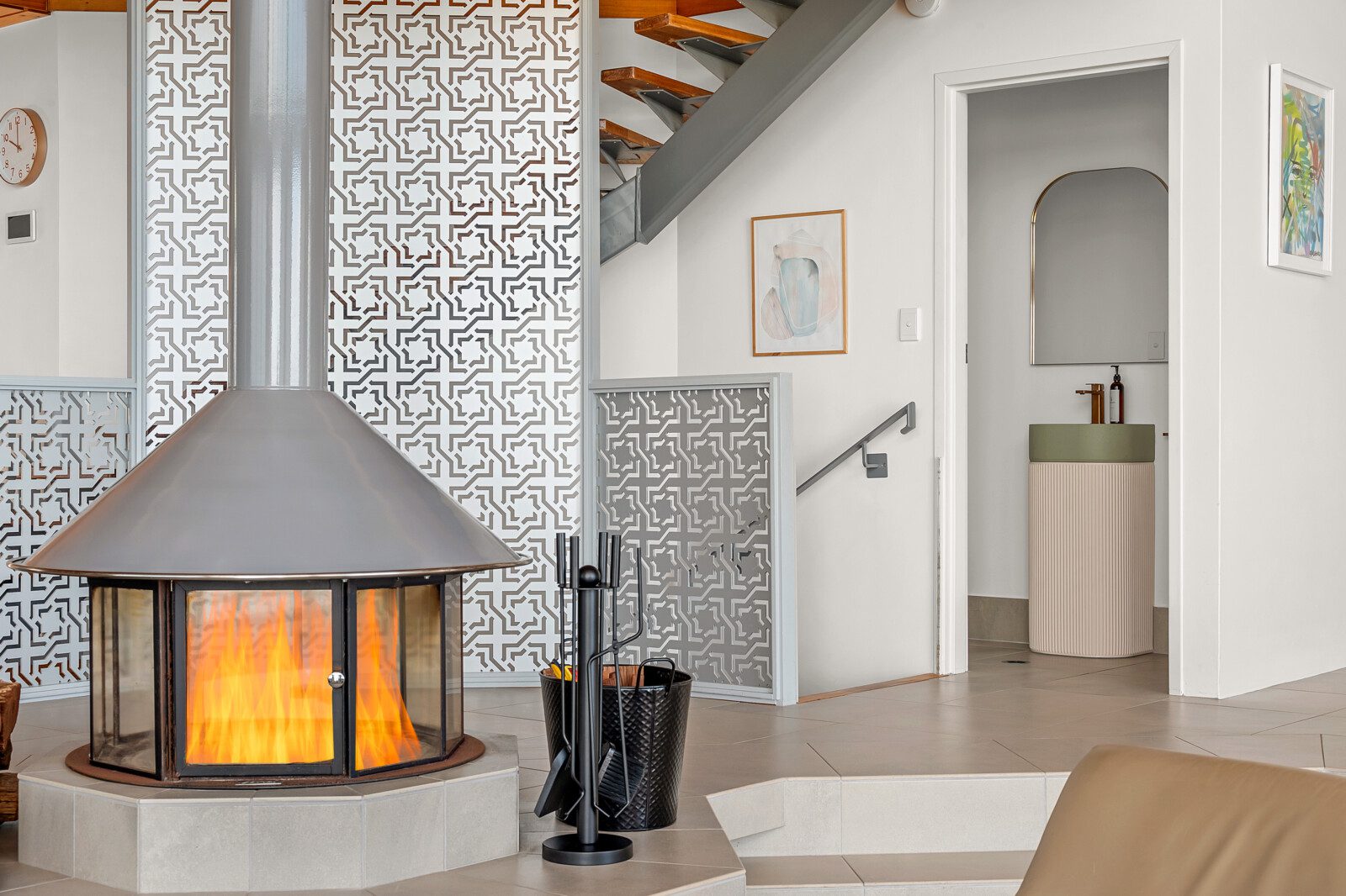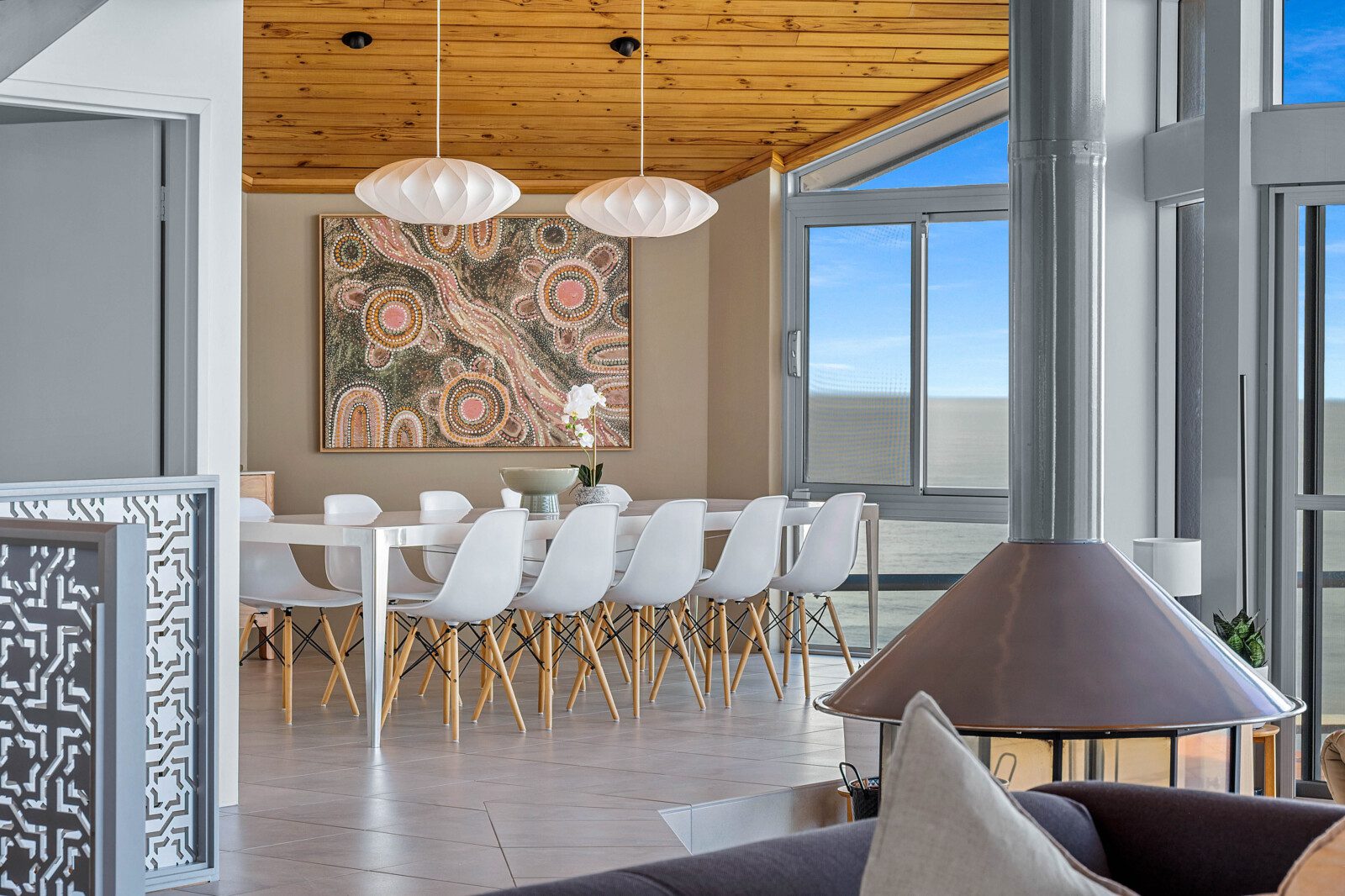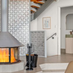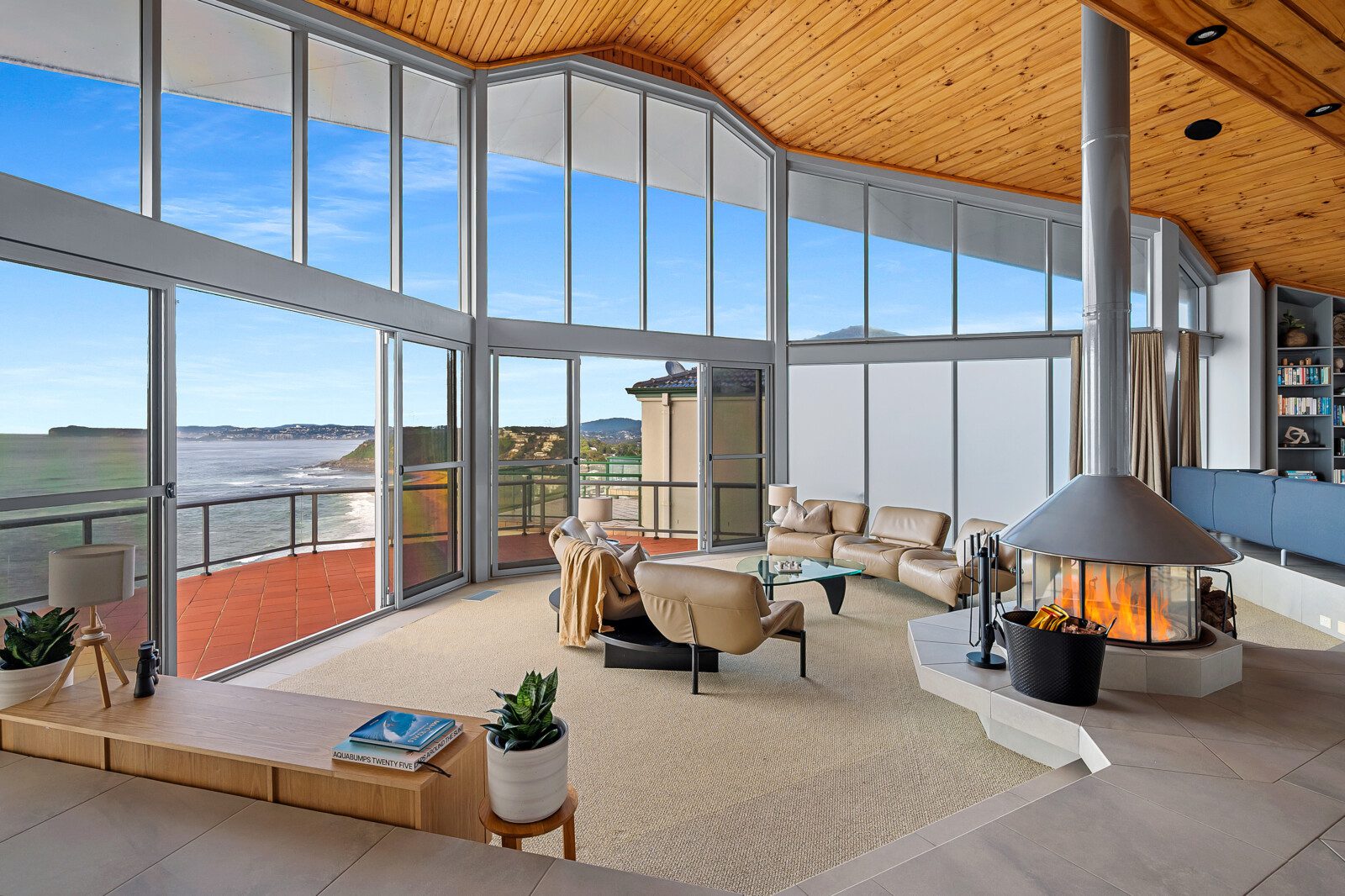 Step into a world where every detail plays its part in the symphony of luxury. The home’s striking octagonal layout orchestrates light, privacy and space, creating rooms that feel both expansive and intimate. In the sunken lounge, a glass-walled wood fireplace provides warmth and atmosphere while the ocean beyond sets the perfect tempo.