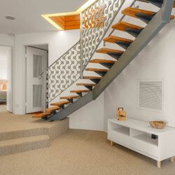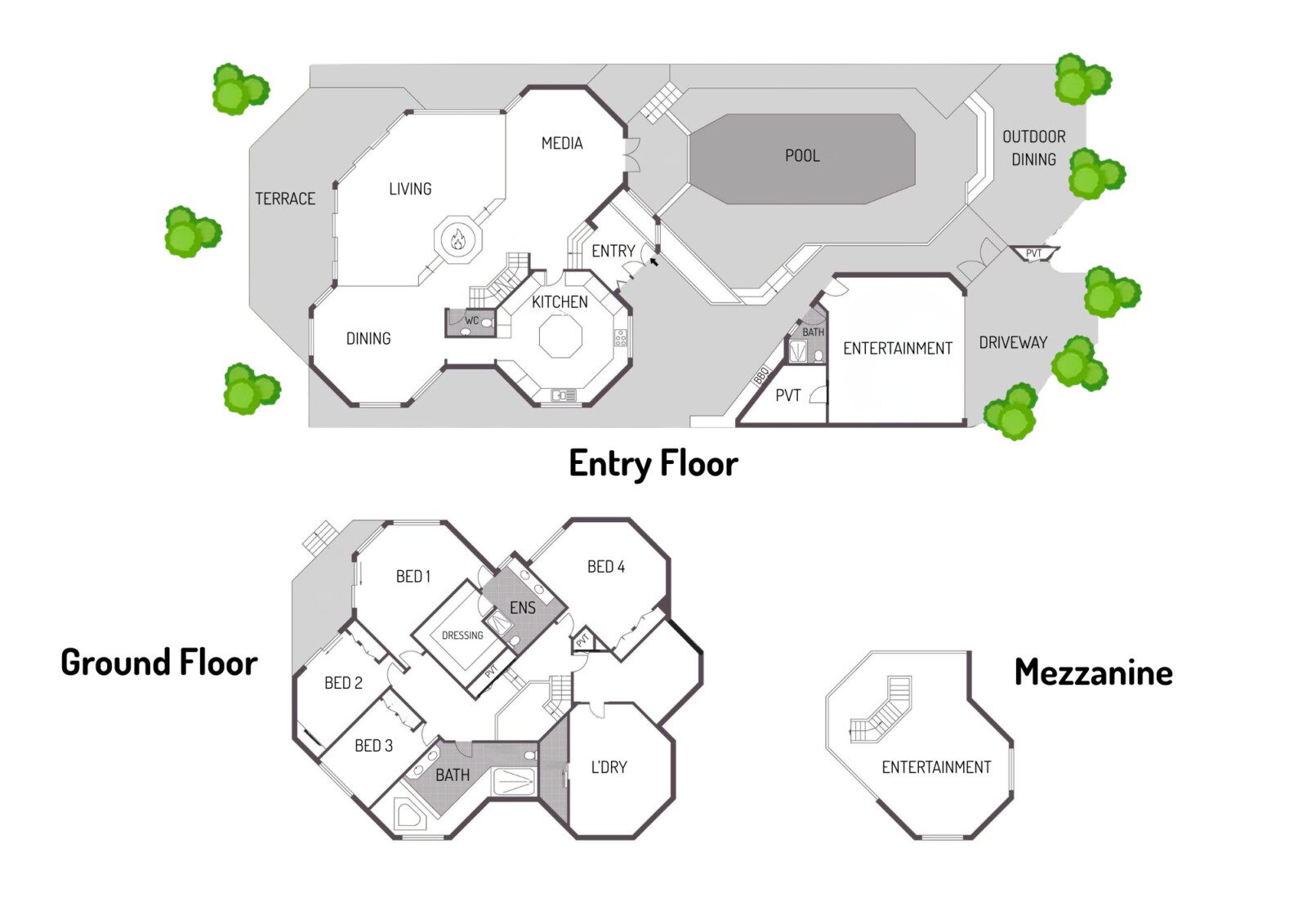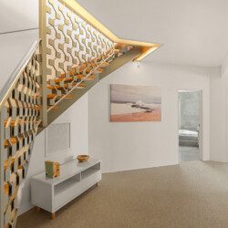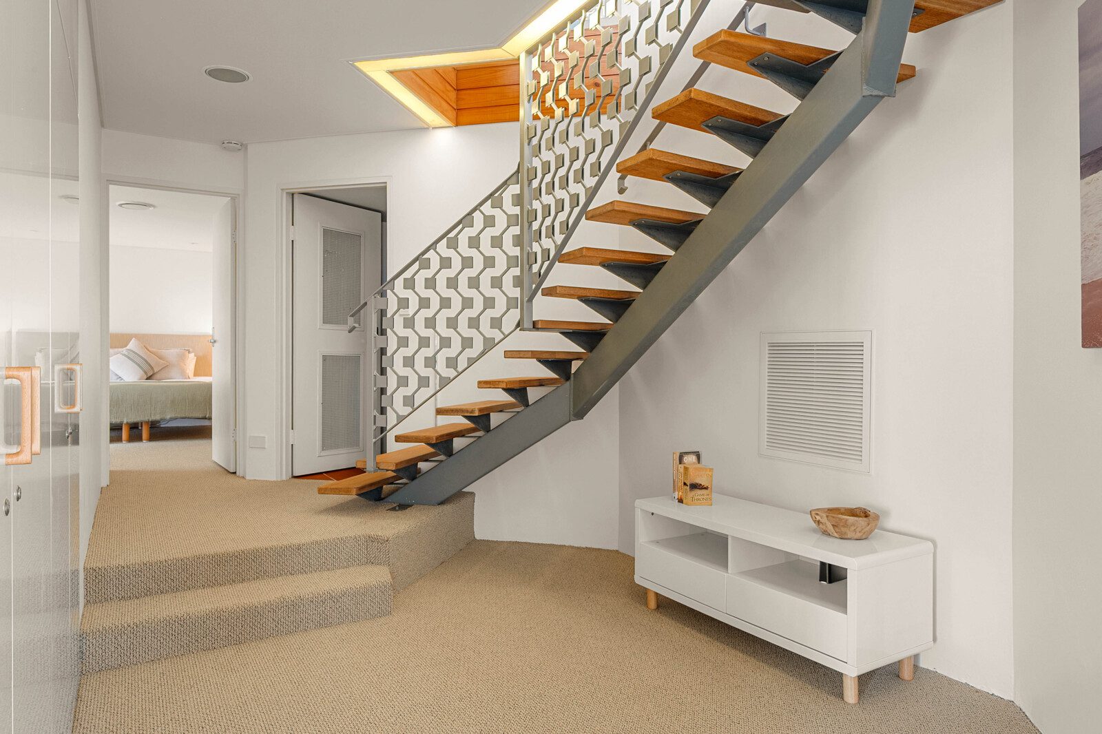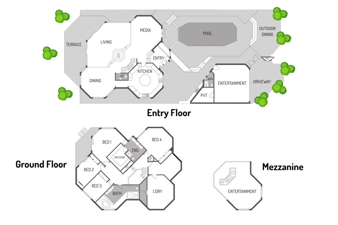 On the entry level, a sunken lounge, media area, kitchen, dining space and guest WC provide versatile living and entertaining zones.