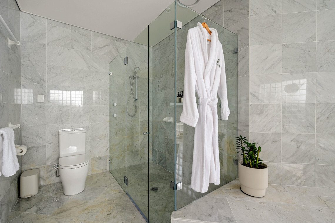 A separate WC with vanity on the entry level and an outdoor bathroom with shower and WC near the pool are thoughtfully positioned, inviting you to rinse off after a swim or a stroll along the beach.